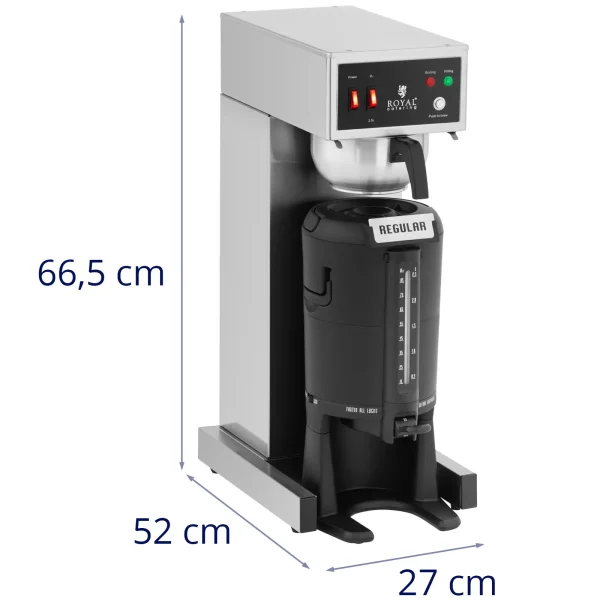 Ekspres przelewowy marki Royal Catering pozwala przygotować duże ilości kawy. Sprawdzi się w kawiarniach, restauracjach czy w cateringu. Łączna moc 1900 W pozwolą zaparzyć dzbanek kawy w ciągu 6 minut. Dioda LED informuje o zakończeniu procesu parzenia. 100 filiżanek na godzinę sprawia, że nigdy nie zabraknie kawy, a pojemnik termiczny o pojemności 2,5 litra utrzymuje ją w odpowiedniej temperaturze. Zintegrowany kranik umożliwia precyzyjne dozowanie gorącego napoju i doskonale sprawdzi się w samoobsłudze przy bufetach, śniadaniach czy w firmach. Obudowa ekspresu wykonana została ze stali nierdzewnej, a poszczególne elementy, takie jak uchwyty, z wytrzymałego tworzywa sztucznego. W zestawie znajdują się pasujące filtry do kawy, które pozwalają przygotować pierwszą filiżankę zaraz po dostawie.