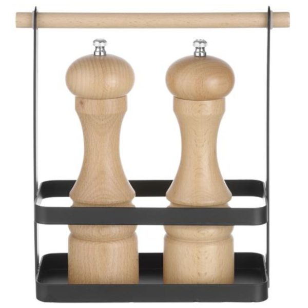 Organizer stołowy na przyprawy marki Hendi. Wyposażony został w uchwyt z drewnianą rączką. Wykończony czarną matową powłoką.