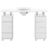 Biurko marki Physa sprawdzi się w studiu paznokci oraz w każdym salonie kosmetycznym. Duży blat zapewnia wystarczająco miejsca do wygodnej pracy. Na jego środku umieszczony został pochłaniacz, który usuwa kurz i pozostałości po paznokciach. Cztery szuflady i półki po każdej stronie pozwalają schludnie przechować wszystkie przybory, co zapewnia porządek. Dołączona poduszka pod dłonie zapewnia maksymalny komfort podczas zabiegów. Gładkie powierzchnie i minimalistyczna konstrukcja sprawiają, że mebel łatwo jest wyczyścić. Jest to nieoceniona zaleta, szczególnie w salonach kosmetycznych. Wysoka jakość wykonania i trwała płyta MDF sprawiają, że stół sprosta wszystkim wyzwaniom w gabinecie, a jednocześnie zachwyca długą żywotnością i nieskazitelnym wyglądem. Ponadto dzięki 8 kółkom można wygodnie ustawić biurko i łatwo je przemieszczać.
