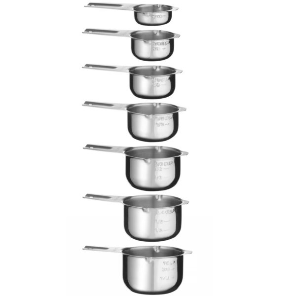 Miarka marki Hendi pozwala precyzyjnie odmierzać składniki przygotowywanych potraw, ciast czy deserów. Wykonana została ze stali nierdzewnej, jest wytrzymała nawet przy intensywnym użytkowaniu. Miarki są do siebie dopasowane, dzięki czemu jest możliwe ich kompaktowe przechowywanie, wszystkie posiadają otwory do zawieszenia. Każda miarka posiada 2 lejki “dzióbki” ułatwiające przelewanie lub przesypywanie zawartości. Grawerowane oznaczenie pojemności znajduje się w dwóch miejscach – na bocznej stronie miarki (w amerykańskiej jednostce cups) oraz na uchwycie (cups i mililitry). Miarki mogą być sztaplowane. Nadają się do mycia w zmywarce. W zestawie 7 różnych pojemności: 1/8 cup = 30 ml, 1/4 cup = 60 ml, 1/3 cup = 80 ml, 1/2 cup = 120 ml, 2/3 cup = 160 ml, 3/4 cup = 180 ml, 1 cup = 240 ml.
